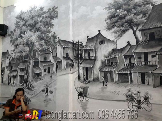 vẽ tranh tường đền ngọc sơn tháp rùa đen trắng