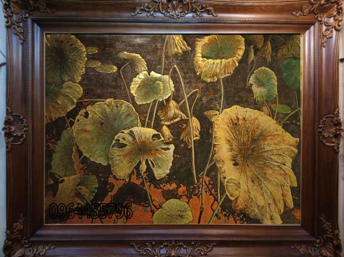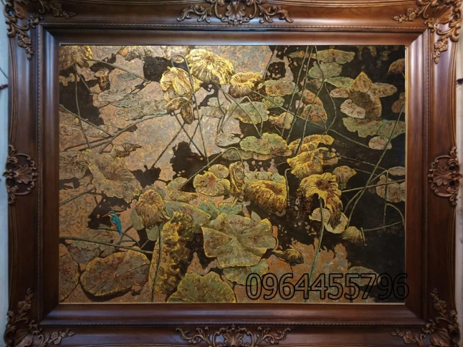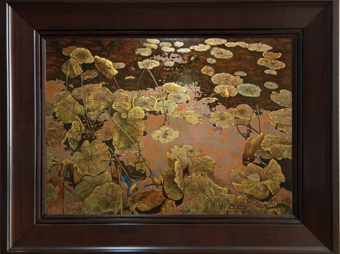 tranh sơn mài sen hoàng hôn dát vàng ta trên vóc