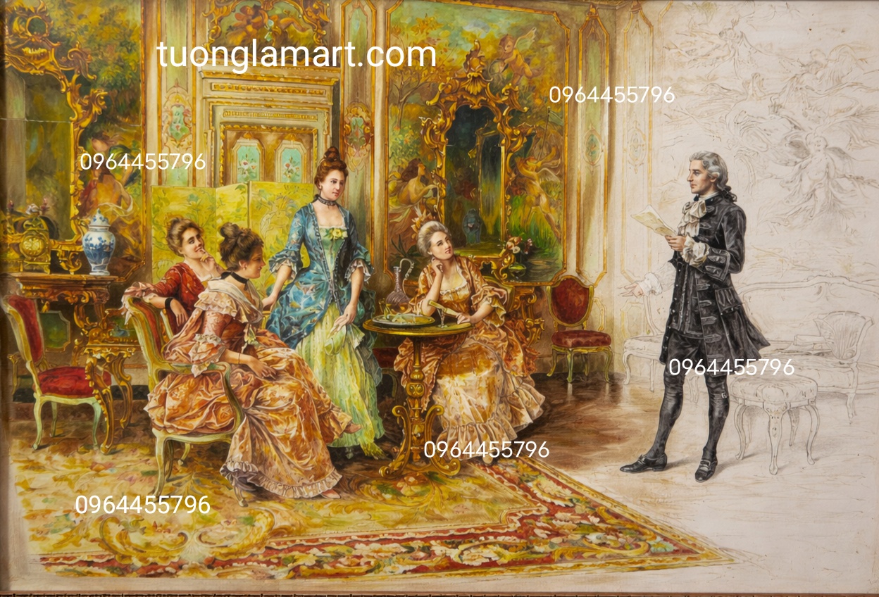 Bức tranh treo tường phong cách cổ điển châu Âu mang đậm hơi thở nghệ thuật quý tộc, tái hiện khung cảnh sinh hoạt thanh lịch của tầng lớp thượng lưu phương Tây thế kỷ trước. Với gam màu vàng ấm sang trọng cùng các chi tiết tinh xảo, bức tranh không chỉ là vật trang trí mà còn là điểm nhấn thể hiện đẳng cấp của gia chủ.